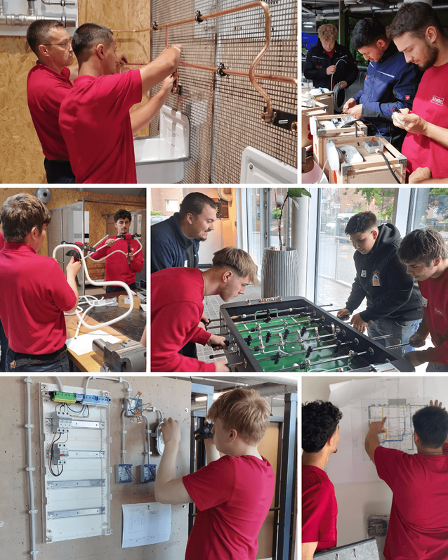 Im Bereich SHK lernen die Azubis zunächst unterschiedliche Materialien kennen, wofür sie diese einsetzen, welche Verbindungstechniken dafür zum Einsatz kommen und mit welchem Werkzeug sie diese bearbeiten. In Schnitt- und Biegeübungen geht es darum, nach Maß zu arbeiten, Rohrleitungen sauber abzuschneiden und in die gewünschte Form zu bringen. Schließlich geht es auch an die Montagewände zur korrekten Installation von Trinkwasser- und Abwasserleitungen.
