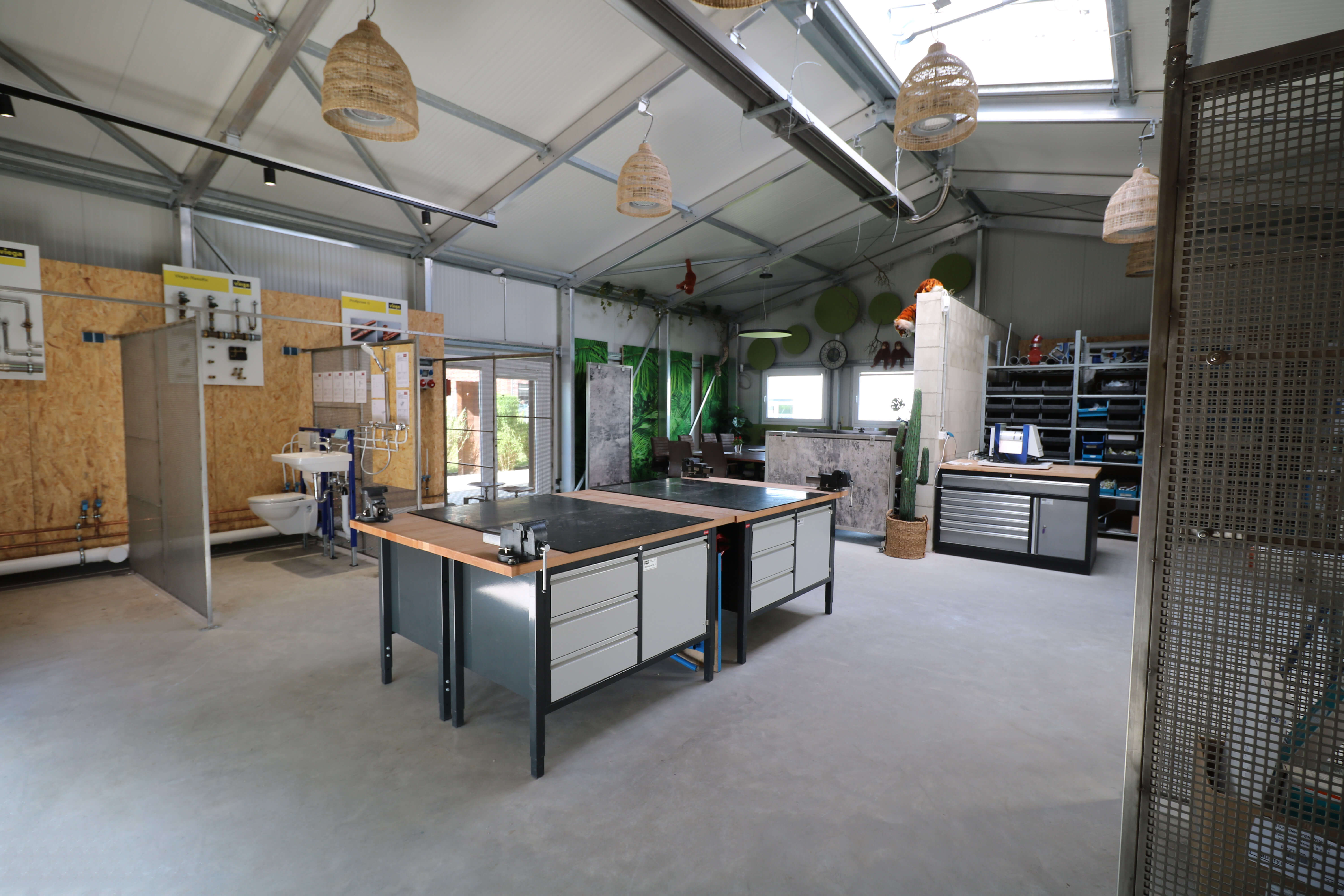 Die neue Ausbildungshalle dient hauptsächlich als Ausbildungsort für unsere zukünftigen Anlagenmechaniker/innen für Sanitär-, Heizungs- und Klimatechnik (SHK). Sie verfügt über einen Schulungsbereich mit Smartboard, ein Materiallager, Werkbänke sowie fest verschraubte Montagewände mit Wasser- und Abwasseranschluss, sodass die Übungskonstruktionen auch getestet werden können. Außerdem ist genug Platz für Lötübungen.